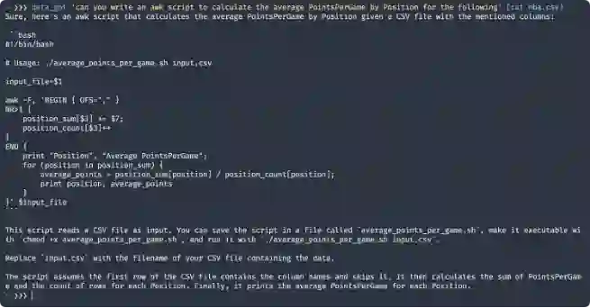 function openai_edits_apih 'can you generate a golang script that reads from stdin and sends that to the OpenAI Code Edits API endpoint - include only the code nothing else' | string replace '```' '' > openai_edits_api.goh 'can you generate the commands to build and run the golang script - only include the commands' | string replace '```' '' > openai_edits_api.shdata_gpt 'can you generate some tests for the following golang script' (cat openai_edits_api.go | string collect) | string replace '```' '' > openai_edits_api_test.godata_gpt 'can you generate a makefile for a golang project with the following files' (ls) | string replace '```' '' > Makefileend