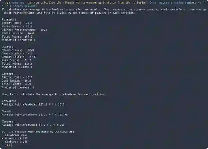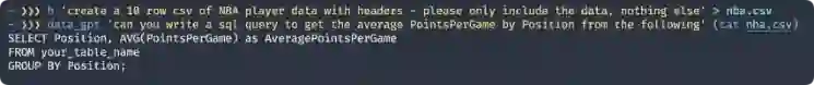 function data_gpt -a prompt dataset prompt_input (echo "$prompt: $data" | string join ' ')curl https://api.openai.com/v1/chat/completions -s \-H "Content-Type: application/json" \-H "Authorization: Bearer $OPENAI_API_KEY" \-d '{"model": "gpt-4","messages": [{"role": "user", "content": "'$prompt_input'"}],"temperature": 0.7}' | jq -r '.choices[0].message.content'end