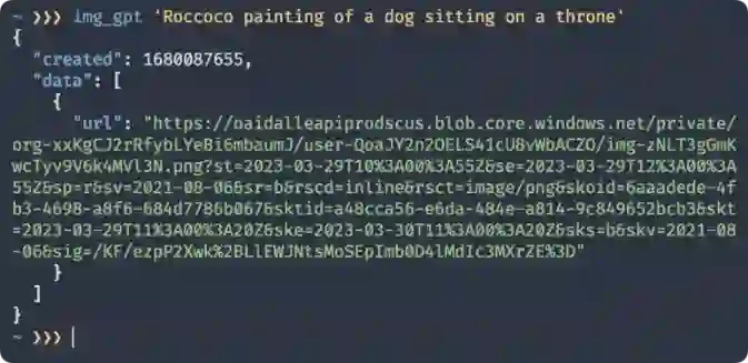 function img_gpt -a promptset create_img (curl https://api.openai.com/v1/images/generations -s \-H "Content-Type: application/json" \-H "Authorization: Bearer $OPENAI_API_KEY" \-d '{"prompt": "'$prompt'","n": 1,"size": "1024x1024"}')echo $create_img | jqset url (echo $create_img | jq -r '.data[0].url')set rand_num (random 1 1000000)curl -s $url -o img-"$rand_num".pngend
