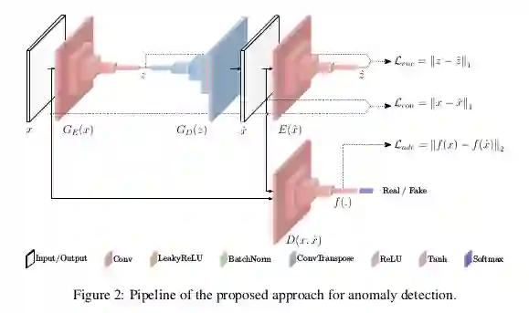 异常检测的发展在深度学习的浪潮下得到了很快的发展,基于 CNN,RNN、LSTM 技术上已经取得了一定的成效。随着 GAN 的提出,对抗的思想越来越引人注意,利用 GAN 做异常检测的文章在实验上有了一定的突破,从 AnoGAN [1] 学习到正常样本的分布,一旦送入异常样本数据发生改变从而检测出异常,这种方法的局限性很强,往往也会带来计算成本的昂贵(需要严格的控制先验分布 z)。在此基础上,为了找到更好用作生成的先验分布 z,在 AnoGAN 的基础上提出了 Efficient-GAN-Anomaly [2] 同样由于做个一次重新映射导致计算成本上也是庞大的。