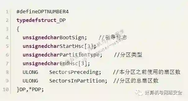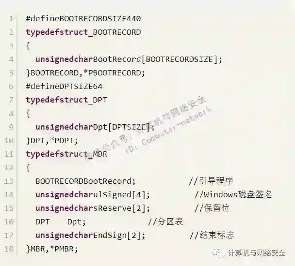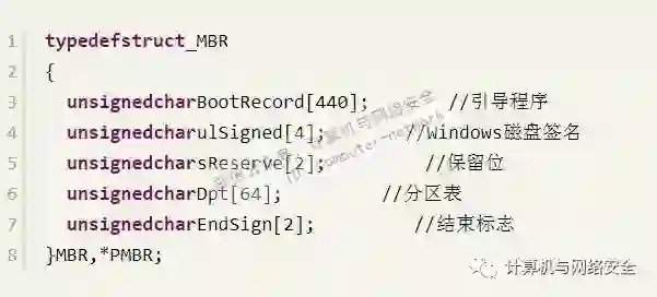 下面介绍如何将MBR的信息定义成一个个的结构体。通过前面用WinHex对MBR的手动分析,我们了解到MBR分为五部分,并且知道每部分占用的字节数。因此,可以将MBR定义为如下: