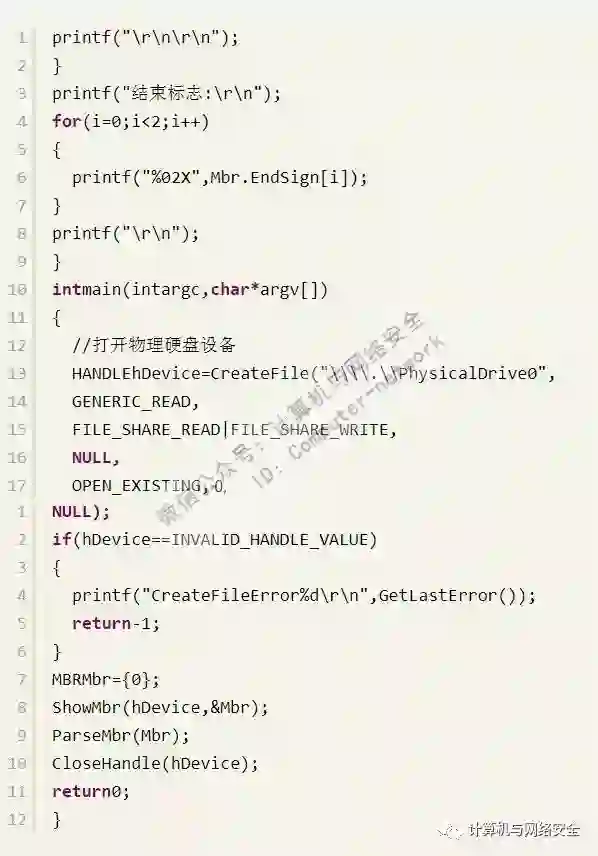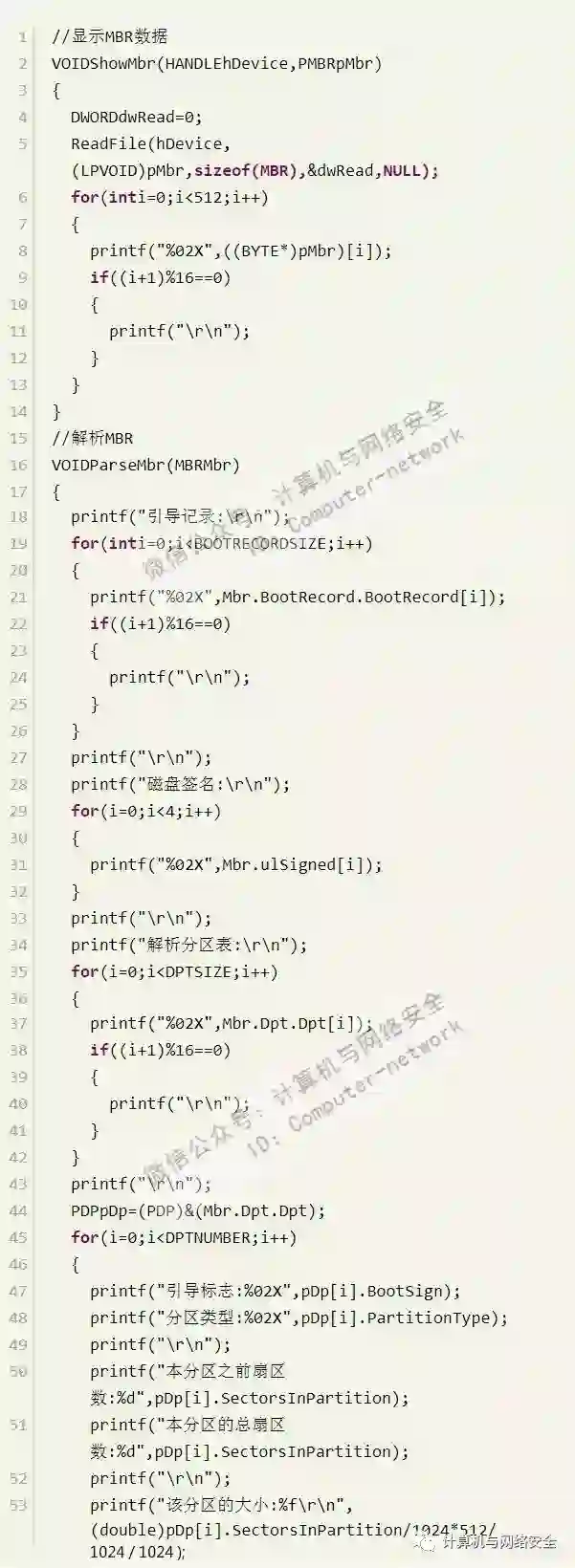 到了这里大家可能会觉得通过程序解析MBR已经不是问题了,下面直接提供程序的代码吧。如果代码中有不理解的地方,可以参考一下我们是如何通过WinHex对MBR的解析了。代码如下: