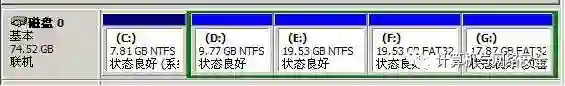 从图7中可以看出,在磁盘上,D盘、E盘、F盘、G盘的周围有一个绿色的框,这个框就表示为扩展分区。