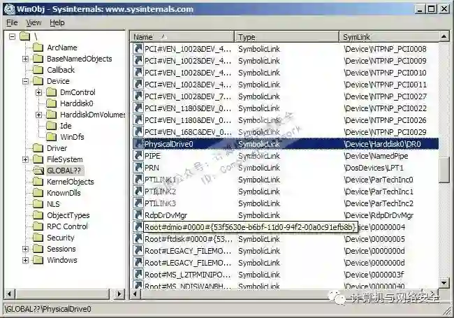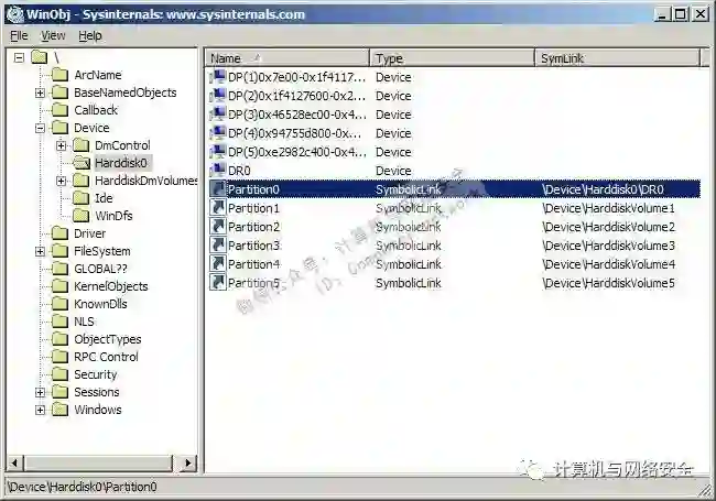 有了上面的结构体,解析MBR已经不是太大的问题了。不过还有一个问题,那就是如何打开硬盘读取MBR。其实很简单,只要打开硬盘设备提供的设备符号链接就可以了。如何找到硬盘的设备符号链接呢?有一款工具WinObj可以帮助查找到。打开WinObj,再依次打开左边的树形控件,如图11所示。