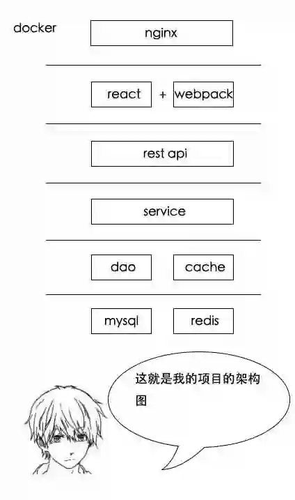 小史:底层mysql是存储,redis是缓存,dao层操作mysql,cache层操作redis,service层处理业务逻辑,rest api层为前端提供rest接口。前端这边用react进行模块化,webpack打包部署。网关nginx进行负载均衡。mysql、redis、nginx和springboot应用都放在docker里部署。