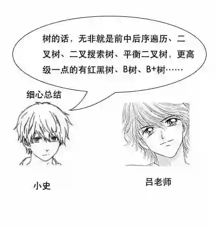 小史:树的话,无非就是前中后序遍历、二叉树、二叉搜索树、平衡二叉树,更高级一点的有红黑树、B树、B+树,还有之前你教我的字典树。