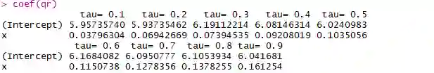 R中进行分位数回归可以使用quantreg包中的rq函数,该函数的使用方法与lm函数相同,另外这个包也提供了关于分位数回归的可视化方法,如查看某个系数在不同分位数回归下的变化情况和置信区间。