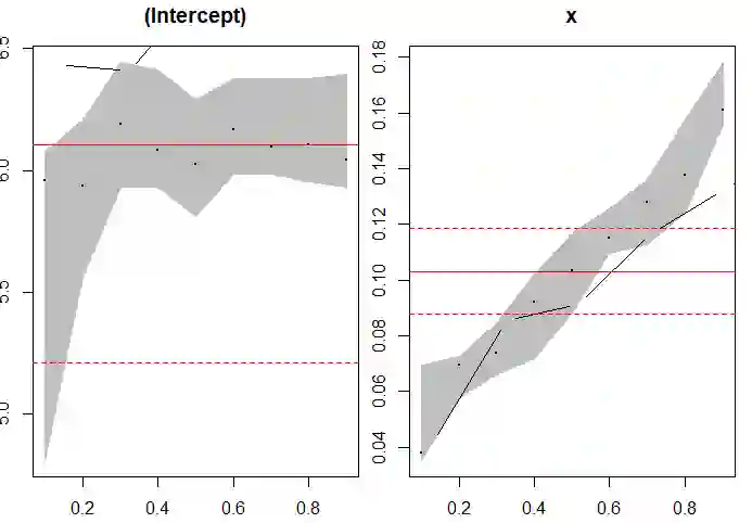 查看不同分位数下截距和斜率的变化,图中的红色实线是线性回归下的截距和斜率,红色虚线是其对应的95%区间.由于quantreg包对基础绘图中plot的改写,一页多图能使用par中mfrow和mfcol设置,不过cowplot中的plot_grid函数可以解决这个问题,它适用于一切绘图系统的一页多图设置。