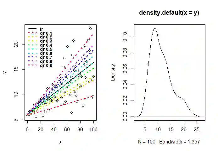 下面左图是y的密度图,可以看到y稍微左偏(不同教材关于左右偏的定义不同,这里认为那边胖尾朝那边偏);右图是lr和qr拟合图,可以看到qr=0.5(中位数回归)的拟合曲线几乎和lr拟合曲线一致。