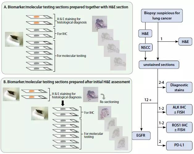 图2. 分子检测最大化利用组织的策略 :准备为分子检测的IHC白片可能在初始的HE染色评估之前(A)或者之后(B)。准备白片数量取决于病理科的策略,为最佳的组织使用和对初始诊断和生物标志物检测结果的最短周转时间