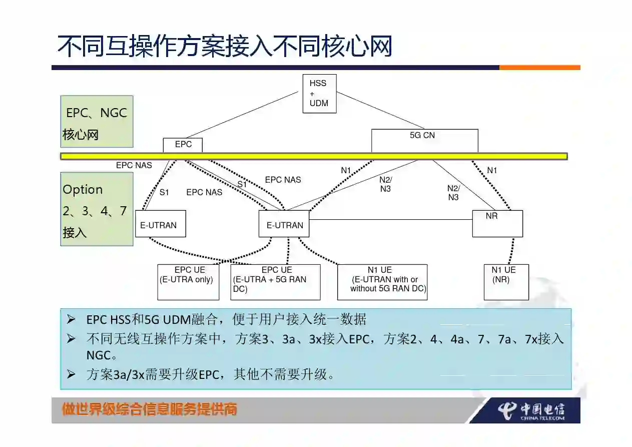 选项 4/4a 架构融合的锚点在 NR 上,最终融合到 5G 的 NGC 中,是 SA 的一个变化,和选项 2 的主要区别在于选项 4/4a 能够将现有大规模的 LTE eNB 利用起来。选项 4 融合的层面在于 4G 无线网和 5G 无线网融合,选项 4a 是在于 4G 无线网增加 1A-LIKE 接口与 5G 的 NGC 核心网。选项 4/4a 架构由于采用了支持 5G NR 和 LTE 的双连接,带来 4G eLTE 的流量增益,采用了新的 5G NR 和 NGC,可以支持 5G 新功能新业务。