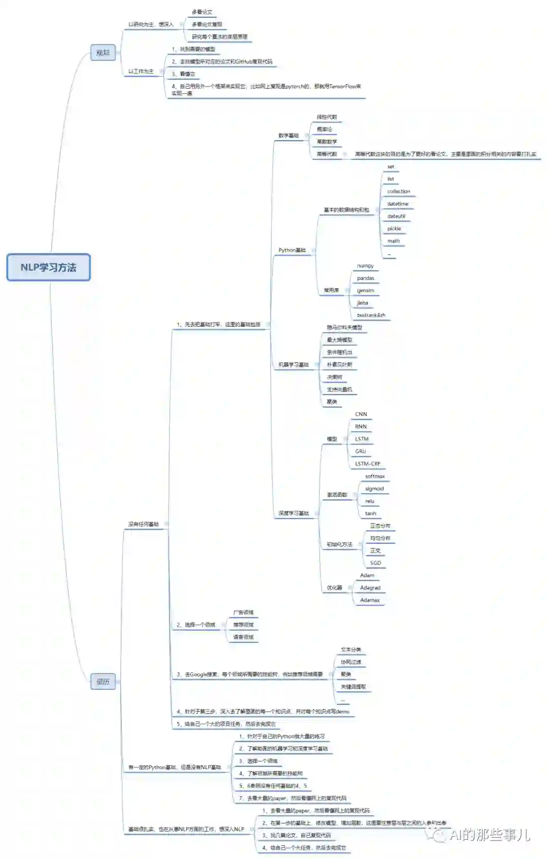 最近几个月,有很多同学都私信我,问我NLP到底应该怎么学,这两天我就根据自己的经验,做了一个简单的总结,导图在手机上看着可能比较小,大家可以在电脑上看,或者保存到手机再放大。如果第一次刷进来没有图,后退重进就好了,可能是因为图太大了。