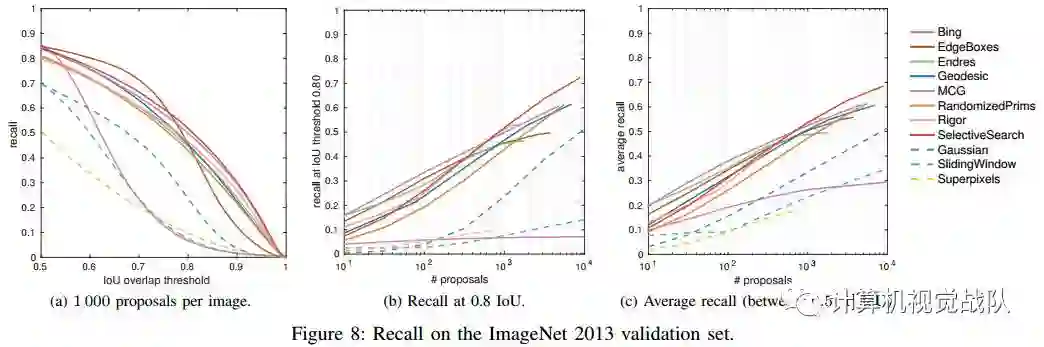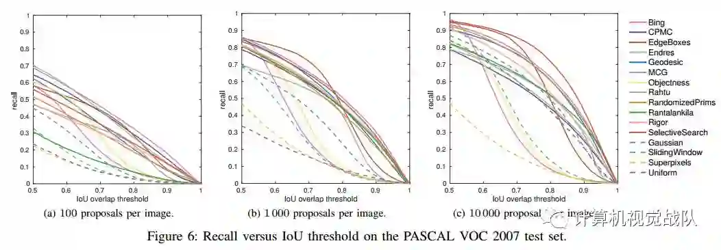 如果一开始没有较好的定位好候选框的位置,随着IoU标准严格,recall会下降比较快的包括了Bing, Rahtu, Objectness和Edgeboxes。其中Bing下降尤为明显;