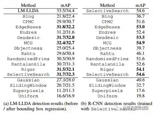 在LM-LLDA和R-CNN下,使得mAP最高的前5个OP方法都是MCG,SeletiveSearch,EdgeBoxes,Rigor和Geodesic,如下图。