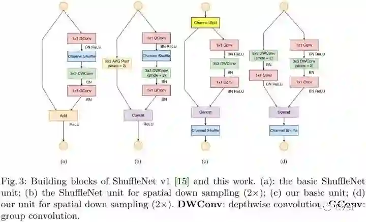 对于带有下采样的模块,需要稍微修改一下模块,移除掉channel split操作。输出的通道数增加一倍。