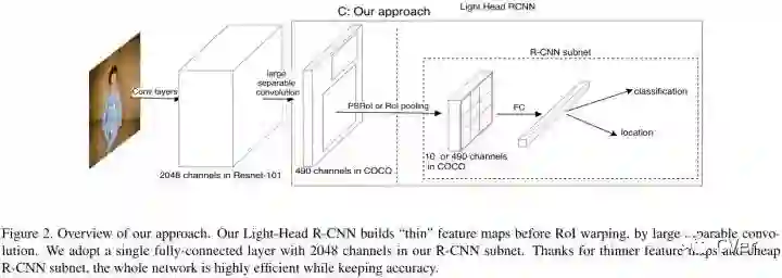 作者使用薄的feature map和简单的R-CNN子网络(池化和单个全连接组成),使得网络的head尽可能的轻。