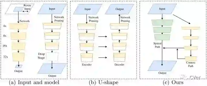 为了弥补空间细节的丢失,实时语义分割使用U-shape的结构(图b)。通过融合网络的层级特征,U-shape逐渐增加空间分辨率并且补充了一些缺失的细节。但是,这种做法有两个缺点:
