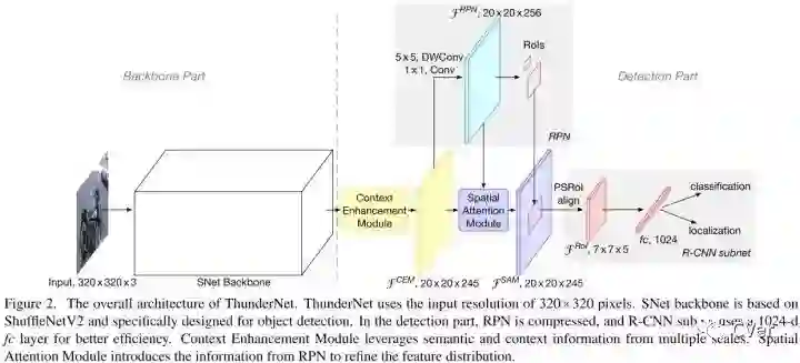 Light-Head R-CNN的做法总的来说还是比较粗糙的,而最近新出的ThunderNet对二阶段检测器进行了全面压缩,从backbone部分到detection部分,从RPN部分到detection head部分,能压缩的全压缩了一遍。不得不说,旷视在轻量级模型设计这一块太厉害了~~ (笔记提到的6篇除了MobileNetV2全是旷视的,膜 ~~ )