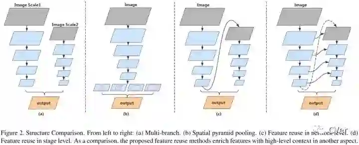 1.使用多个分支来进行多尺度的特征抽取并且保留图像的空间细节(图a)。但是这种方法缺乏对由并行分支结合而成的高级特征的处理,另外,并行分支的特征缺乏信息交流,还有,在高分辨率图像上额外添加分支对速度有影响。