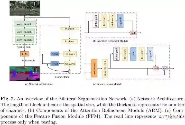 基于对过去工作的分析,作者提出了Bilateral Segmentation Network(图c),引入了2个组件Spatial Path和Context Path,分别用来解决空间信息的丢失和感受野的不足。为了在速度不降低的情况下提升精度,作者还引入了FFM和ARM结构,分别进行两个分支的融合和精炼预测结果。