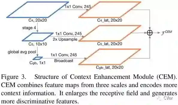 进行广播,得到三个分辨率相同的feature map,最后三个feature map进行特征融合。比起FPN结构,CEM只添加了2个卷积和一个fc层,计算开销上更加友好。