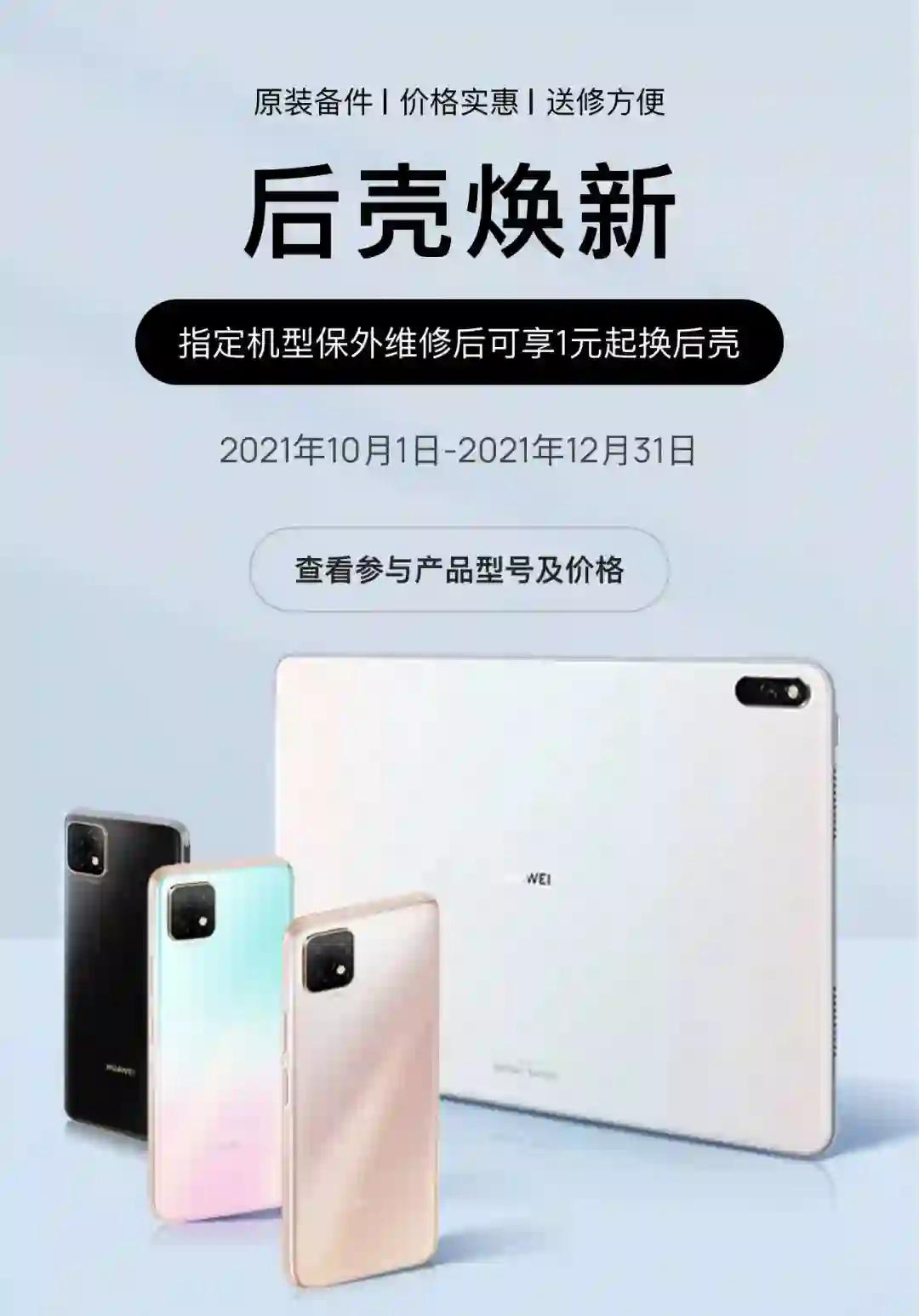 为解决消费者手机/平板后壳长时间使用导致的磨损、划痕、脏污等问题,华为针对部分机型推出"后壳焕新"活动,指定机型保外维修后,可以享受 1 元起换后壳。凭借设备序列号即可参与一次,保内维修后的设备不支持参与本活动,活动时间截止到 21 年 12 月 21 日。