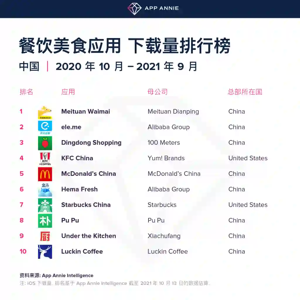 近日, App Annie 发布餐饮美食应用下载量排行榜分析报告,在 20 年 10 月至 21 年 9 月的 12 个月中,"美团外卖"应用全球下载量已超过 1 亿次,获得超 900 万次的评分,覆盖中国 250 多个城市的餐厅,毫无意外的成为餐饮美食类别中下载量排名第一的 iOS 应用,高居榜首。
