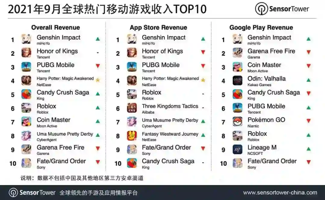 今日, Sensor Tower 公布了 2021 年 9 月全球热门移动游戏收入 TOP 10,米哈游戏《原神》移动端全球收入超过 3.41 亿美元,位列全球手游收入榜榜首,其中中国是该游戏收入最高的市场,中国 iOS 收入占 31.6%,美国市场占 21.7%;腾讯《王者荣耀》以 2.09 亿美元的收入位列榜单第 2 名,中国 iOS收入占 95%,海外收入占 5%。榜单前五另外三款游戏为腾讯《PUBG Mobile》、网易《哈利波特:魔法觉醒》和 King《Candy Crush Saga》。
