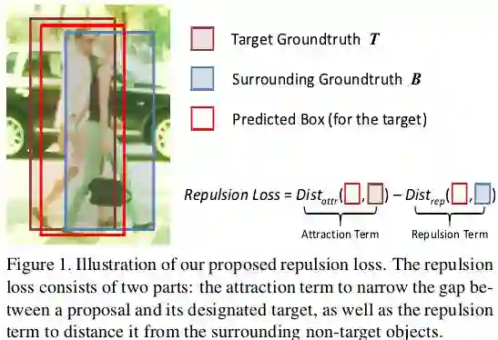 本文重点解决的问题是:在行人个体之间的相互遮挡时,如何提高行人检测的准确率。无论是在自动驾驶还是智能监控场景下,行人以群体形式出现的情况时有发生,如图1所示:两个行人个体之间存在着相互遮挡,而这种遮挡对检测算法的影响体现在两个层面:一是目标框定位不准确,如图中红色框;二是算法对NMS的阈值的选取更为敏感了,如果NMS阈值选取过小,则周围的目标框就被过滤掉了(图中蓝色框),但蓝色框对于图中女士而言却是正确的预测,如果NMS阈值选取过大,则又会带来更多的虚检。对于这样一个两难问题,作者的解决思路在图中的式中也得到了直观体现:该思路的核心就是一种全新的loss,叫做Repulsion loss,其包括两个部分:前者是使得预测框更接近目标框,后者是使得预测框要尽可能远离周围的目标框。