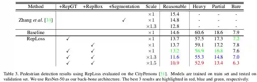 可以发现加上RepGT loss和RepBox loss,都可以给baseline带来较为明显的性能提升,尤其是在遮挡情况较为严重的情况下(Heave occlusion)的效果最为显著。本文的两种loss共同将baseline在Reasonable设定下的Miss Rate从14.6减少到了13.2。最后将图像扩大1.5倍得到了最佳的10.9的表现。