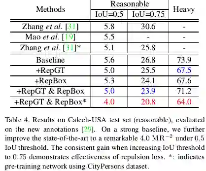 (2)值得注意的还有表3,尽管repulsion loss将检测器在Reasonable设定下的Miss Rate从14.6减少到了13.2(下降了1.4个点),但仅仅将图像扩大1.5倍,Miss Rate又从13.2下降到了10.9(下降了2.3个点),我们知道图像扩大是为了检测到更多的小目标,足以说明弱小目标的存在对检测器的性能影响同样是不容忽视的。那么,针对弱小目标的检测,能否从loss层面找到一个合理的解决方案呢?期待你的精彩发现。