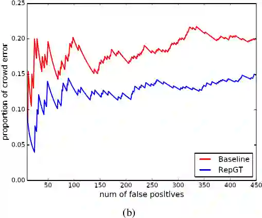 针对以上分析,作者决定从loss层面来解决行人之间的自遮挡问题,首先我们直观感受下本文方法RepGT的有效性,如下图所示:图(a)展示了RepGT对漏检的有效性,可以发现在detection score较高时,RepGT的漏检更少,图(b)展示了RepGT对自遮挡情况下的虚检的有效性,可以发现RepGT的虚检中自遮挡所导致的虚检比例更低。