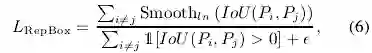因为LRepBox是使得预测框Pi和周围的其他预测框Pj尽可能远离,Pi和Pj分别匹配上不同的目标框,它们之间的距离采用的是IoU,则RepBox loss定义为: