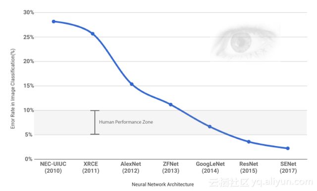 从ILSVRC中可以看出,近几年图像分类神经网络架构的错误率以惊人的幅度下降