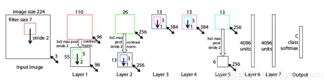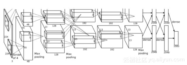 这个CNN架构模型清晰地展示了两个GPU之间的责任划定:一个GPU运行图形顶部的图层部分,另一个运行图层底部的图层部分。