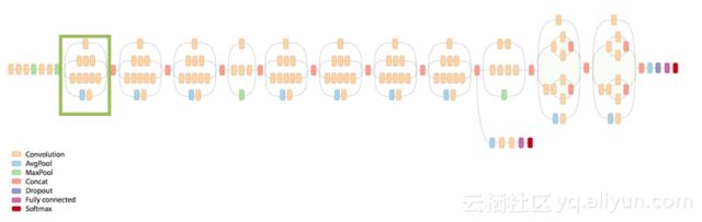 GoogLeNet架构的示意图,突出显示的框是启动模块。