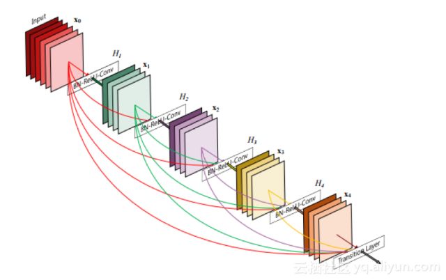 一个5层密集块。每个图层都将前面的所有要素图作为输入。
