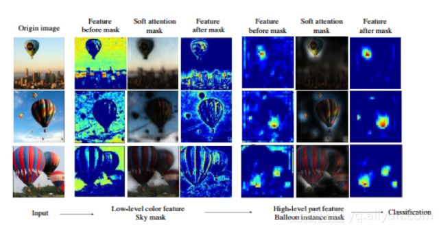 Residual Attention Network分类插图:选择的图像显示不同的功能在参与注意网络中具有不同的对应注意掩码。天空面具减少了低级别的背景蓝色功能。气球示例蒙版突出显示高级气球底部特征。