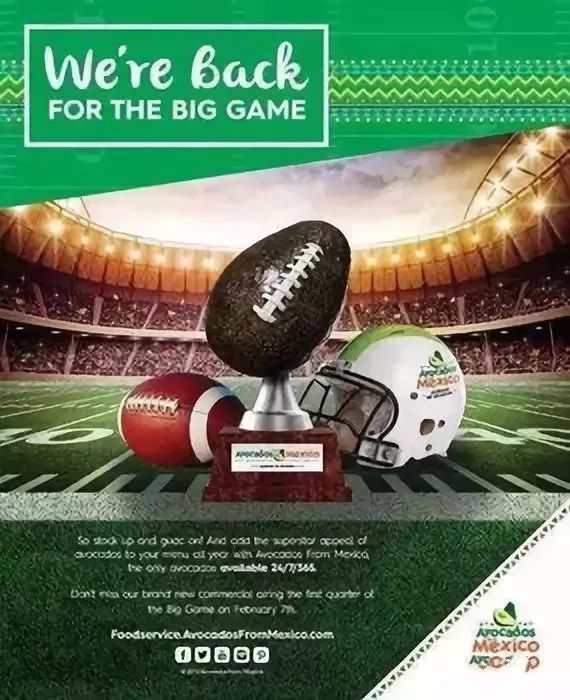 此后,该公司连续4年购买超级碗广告,将牛油果和橄榄球牢牢绑定在一起。他们在橄榄球选手食谱中加入牛油果,不断暗示这是健康水果;同时,宣传牛油果是看橄榄球比赛的必备食物。