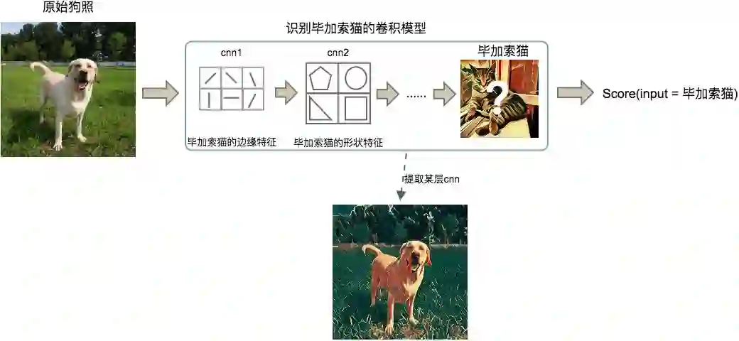 模型会给你反馈一个概率分数,表示它相信这是一张“毕加索猫”照片的程度。这中间经历了很多CNN层,每层CNN都在狗狗照片上寻找输入样本是毕加索猫的图形特征证据,越底层的神经元分析的特征越具体,越高层越抽象。当然,最后模型会给出很低的分数。