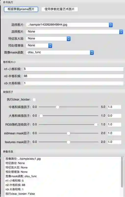 如果你不知道什么样效果最好或者想要所有可能的效果图,那么你可以看到GUI的界面上还有个按钮“使用参数批量艺术图片”,它的作用是使用刚刚调整好的n1, n2, dd等参数作为固定参数,将引导特征图、放大层特征、预处理增强等作为所有可能的排列组合,通过一键生成成百上千张的风格图像,代码详情请查看PrismaController.py。