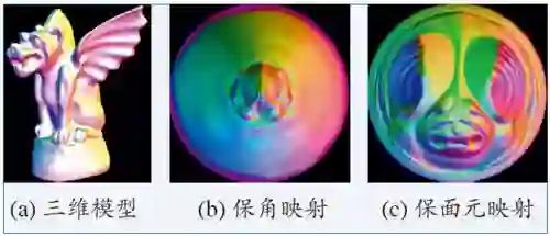 我们将大卫雕像模型(如图1(a))共形(保角)地映射到平面上(如图1(b)),看上去似乎变化很大,其实不然,因为这是保持角度不变的。如果我们在参数区域平面上画好网格点,然后将这些网格点映射到人脸上,就能在人脸上显示出很漂亮的网格图形(如图1(c))。共形映射在工程中应用很广,因为它能将图上的无穷小圆仍然映射成无穷小圆,从而不会导致太大的变化。