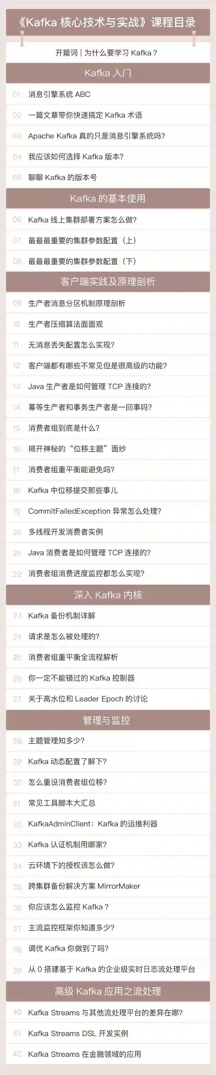 另外,《Kafka 核心技术与实战》专栏作为一次全新的交付,我希望能用 更轻松更容易理解的语言和形式,帮你获取到最新的 Kafka 实战经验。