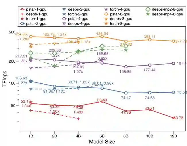 上图展示了DeepSpeed stage3,PyTorch系统在 1、2、4、8 个 GPU 上的性能。y 轴通过对数方式重新缩放。这些点代表在一个 GPU 上使用 4、8、16、32 和 64 批大小测试的最佳结果。圆点周围的值表示 派大星 在 Tflops 中的吞吐量及其对 DeepSpeed 的加速。deeps 是 DeepSpeed-DP,deeps-mpX 是 DeepSpeed使用X路的模型并行结果。模型的计量单位是B表示十亿Billon。