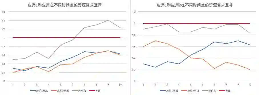 这样的时间曲线比普通的标量规定的资源需求具有更多的优化空间,但也带来了更多的复杂度。下面这个图是两个应用在不同时间点的资源需求对于满足机器容量的互斥(左)与互补(右)的例子。