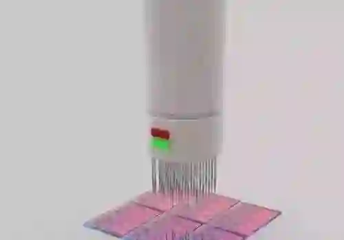 内核级别,大约10毫米/0.5英寸。图中是晶圆的局部,正在接受第一次功能性测试,使用参考电路图案和每一块芯片进行对比。