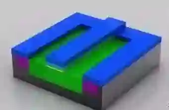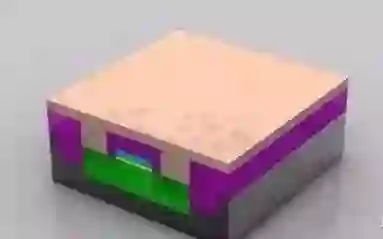 至此,晶体管已经基本完成。在绝缘材(品红色)上蚀刻出三个孔洞,并填充铜,以便和其它晶体管互连。