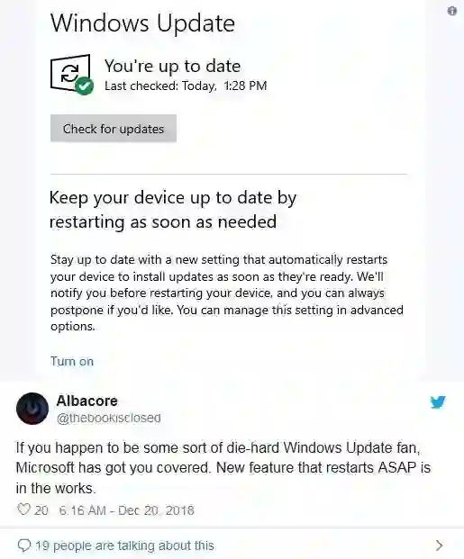 如果这个“尽快重启(restart ASAP)”功能真的要推出,那么它很有可能会随下一个Windows版本(代号19H1,计划2019年4月左右发布)到来。