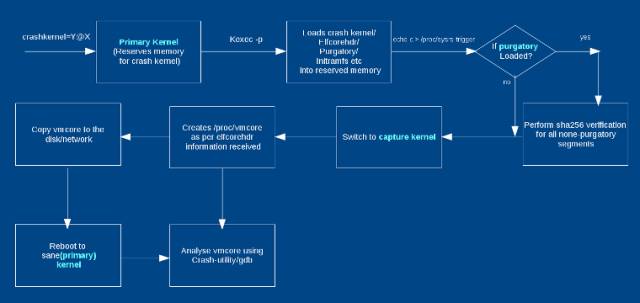 当“第一内核”崩溃时,它执行必要的退出过程并切换到 purgatory(如果存在)。purgatory 验证加载二进制文件的 SHA256,如果是正确的,则将控制权传递给“捕获内核”。“捕获内核”根据从 elfcorehdr 接收到的系统内存信息创建 vmcore。因此,“捕获内核”启动后,您将看到 /proc/vmcore 中“第一内核”的转储。根据您使用的 initramfs,您现在可以分析转储,将其复制到任何磁盘,也可以是自动复制的,然后重新启动到稳定的内核。