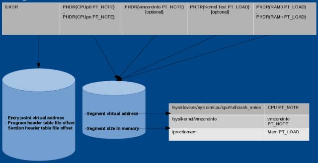 vmcore 从 elfcorehdr 开始,它具有与 ELF 程序头相同的结构。参见下图中 elfcorehdr的表示: